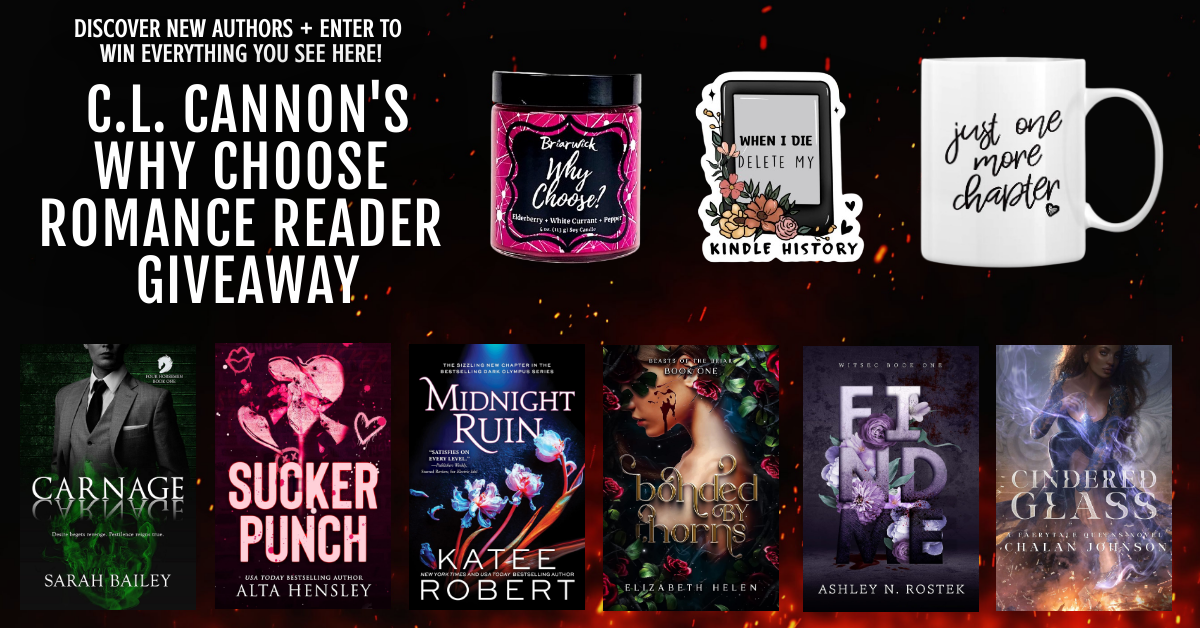 Maximum ARV of all prizes: $200. Prize includes: Print copies of Carnage by Sarah Bailey, Sucker Punch by Alta Hensley, Midnight Ruin by Katee Robert, Bonded By Thorns by Elizabeth Helen, Find Me by Ashley N. Rostek, and Cindered Glass by Chalan Johnson, plus a bookish mug, Why Choose candle, and a "delete my kindle history" sticker!. If winner is unable to receive payment then prize will be forfeited, and an alternate winner may be selected in accordance with these Official Rules from among the remaining eligible entries for that prize. Prizes may not be transferred or assigned except by Sponsor.